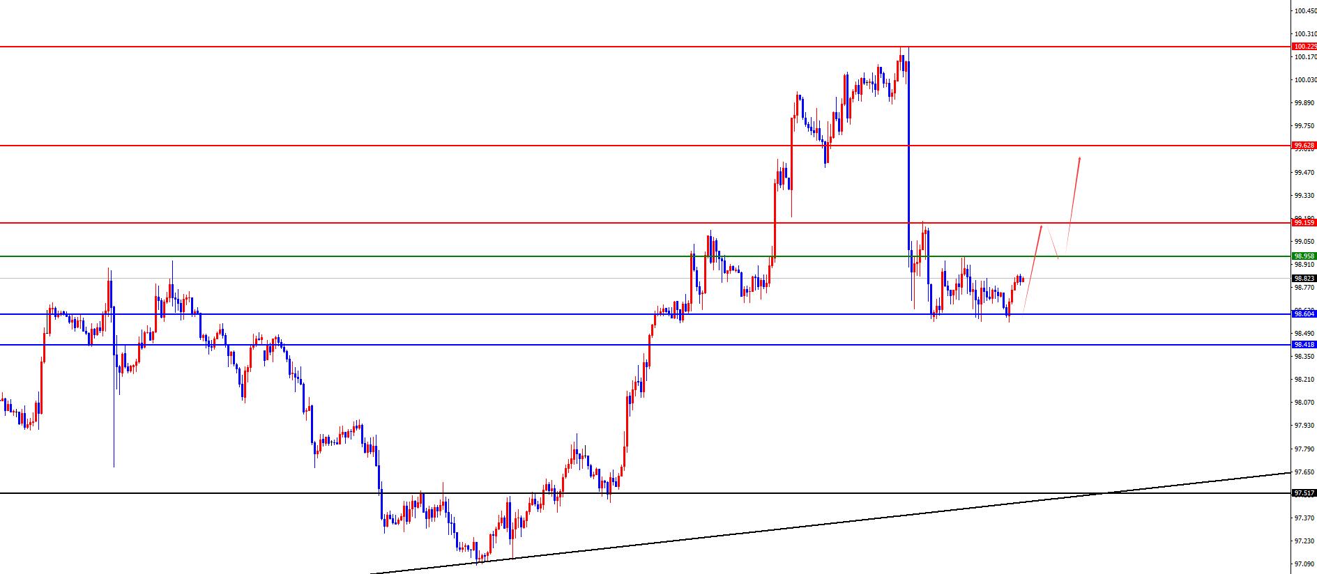 US Index 98.4The range is long, with a defense of 97.90, and a target of 98.95-99.15-99.60