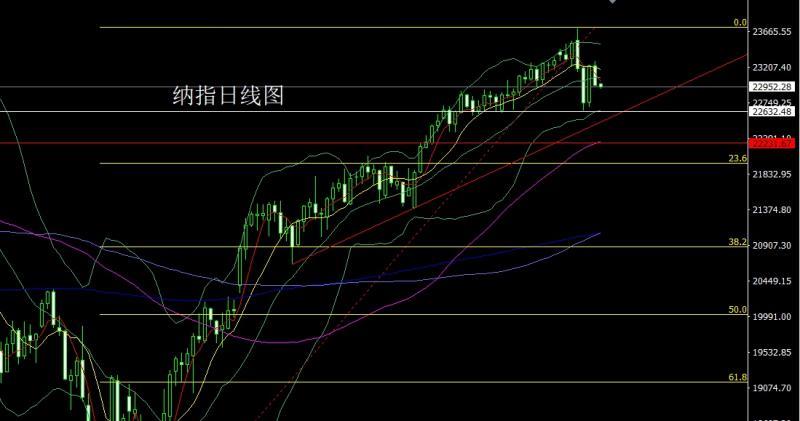Nasdaq market opened at 23227.51 yesterday and the market fell back to 23192.85. After the market rose, the daily line reached the highest point of 23290.18. After the market fluctuated strongly. The daily line was given the lowest point of 22970.2. Then the daily line was a saturated large negative line with a slightly longer upper shadow line. After this pattern ended, today's short stop loss of 23180 at 23120, the target below is 22970, and the falling below is 22900 and 22820-22800.