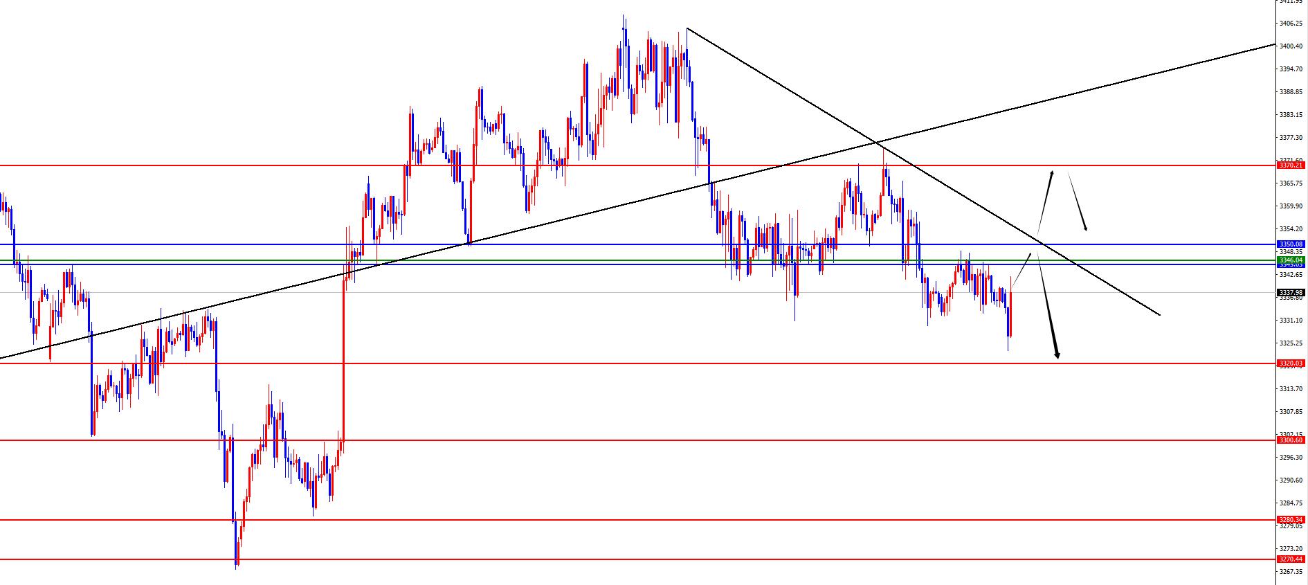 From multi-cycle analysis, first observe the monthly line rhythm. The price will run at the rhythm in May as the author said, and the final cross state. The final price in June is still in an anti-K state. For the current need to pay attention to the gains and losses of the monthly line high and low points, the price will continue to be under pressure after the price breaks the monthly line low point. From the weekly level, the price on the weekly line has been fluctuating in two negative and two positive recent times. Last week was the first week of decline, and this week continues to pay attention to pressure. The weekly long-short watershed position is at 3345. From the daily level, the current daily resistance is at 3350, and the overall daily line is currently bearish, so it continues to be laid out at high altitudes. Four hours is the key to the short-term trend. Currently, the four-hour resistance is at 3350. In the first test, we need to pay attention to the continued pressure, but we need to pay attention to the issue of pressure. Considering that the weekly daily line and the four-hour resistance are both in this area, we should look at the pressure before breaking through, and even if it breaks through, it will surge and fall. There is currently a divergence in the price in one hour, so we need to pay attention to the short-term adjustment and oscillation of the market and wait for the fluctuation to be further under pressure.