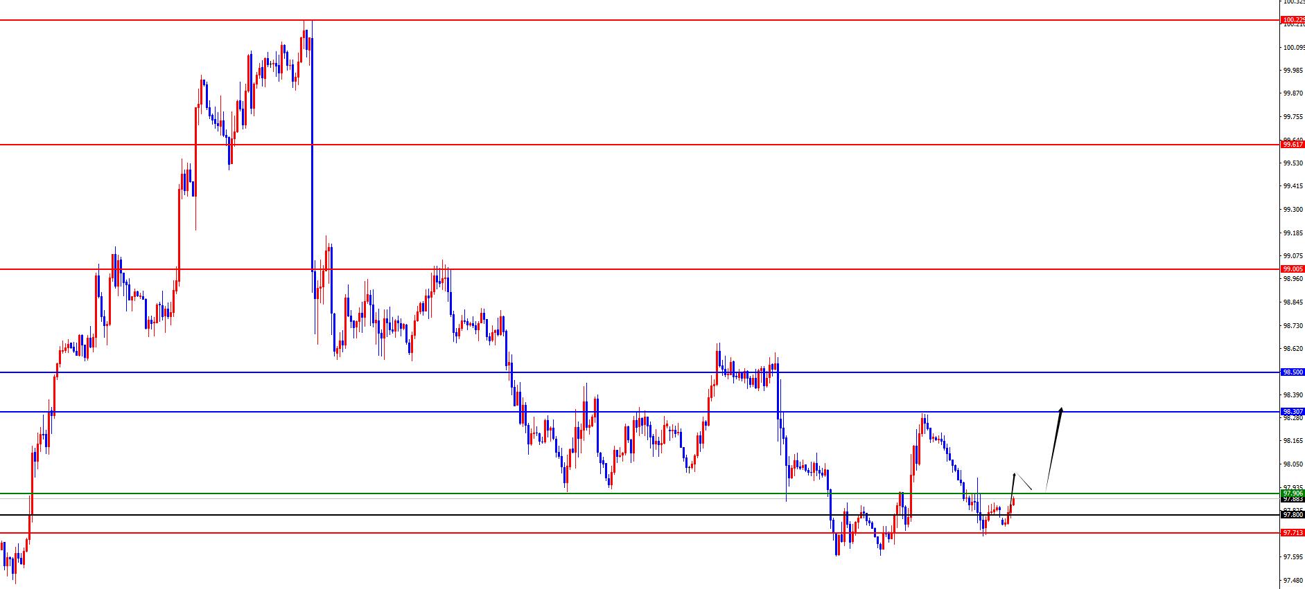 From a multi-cycle analysis, the price breaks through the weekly resistance last week, and then breaks the weekly support again last week. Recently, the price consolidates up and down on the weekly support. This week, the key is to focus on whether the 98.30 position can stand firm. At the daily level, the price did not stabilize the daily resistance in the market last week, but the daily price has shown further growth at present, so the focus will be on the daily resistance of 98.50 in the future. Once it breaks through, it is expected to soar again in the future. From the four-hour perspective, the four-hour trend is the key to our long-term price trend. Currently, the four-hour resistance is at 97.90, and the price fluctuates in the short term, but it is still paying attention to the continued rise before the subsequent low. From the one-hour level, the current price has shown strong growth. Pay attention to the 98.30-98.50 area above, and the breakthrough will accelerate.
