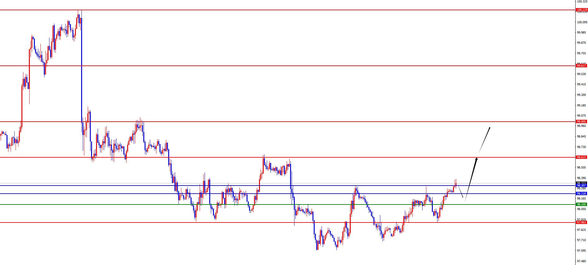 From a multi-cycle analysis, the weekly level has recently been supported by the weekly support up and down. This week, the focus is on the 98.30 position to stabilize. Once it stands firm, the medium-term bulls will continue to rise. At the daily level, last week, the price suppressed the daily resistance position and continued to fluctuate below the daily resistance position. Currently, the daily resistance is at 98.20. The price is more www.xmspot.commonly treated with the band above this position. From the four-hour perspective, the four-hour perspective is the key to our emphasis on short-term price trends. After the price rose on Monday, it continued to rise based on the four-hour support yesterday. Currently, the four-hour support is in the 98.10 area, and the price is more treated above this position. Based on the multi-cycle view, the price will continue to pay attention to the upward trend in the range of 98.10-30, and the subsequent focus will be on further continuation of bulls.