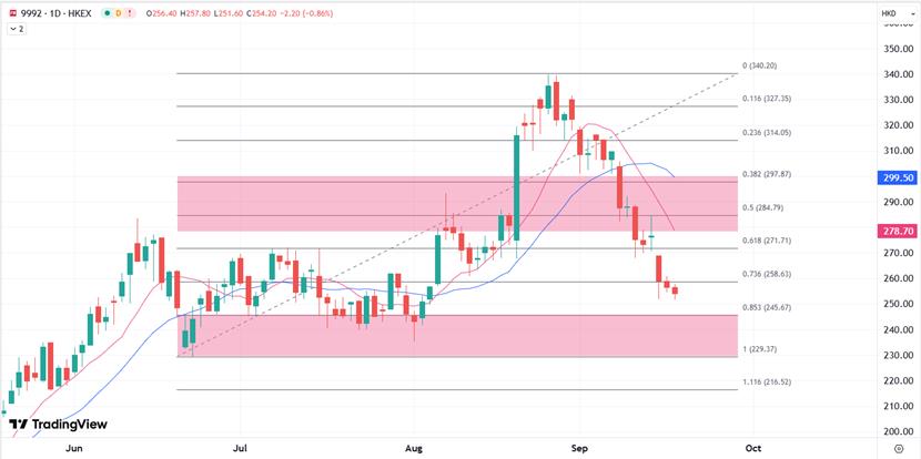 XM Hong Kong Stocks: Pop Mart (09992.hk) El precio de las acciones) ha caído recientemente, con una disminución acumulativa del 24% desde el final de agosto de agosto. Mostró su mayor caída desde abril del lunes, con una fuerte caída de casi el 9% en sesión, la mayor caída en cinco meses. El precio actual de las acciones ha alcanzado el más bajo desde principios de agosto, correspondiente a las expectativas de calificaciones de ingrato de las instituciones de calificaciones, lo que ha intensificado las preocupaciones de las personas sobre la disminución de la popularidad del producto de la www.xmspot.compañía.
