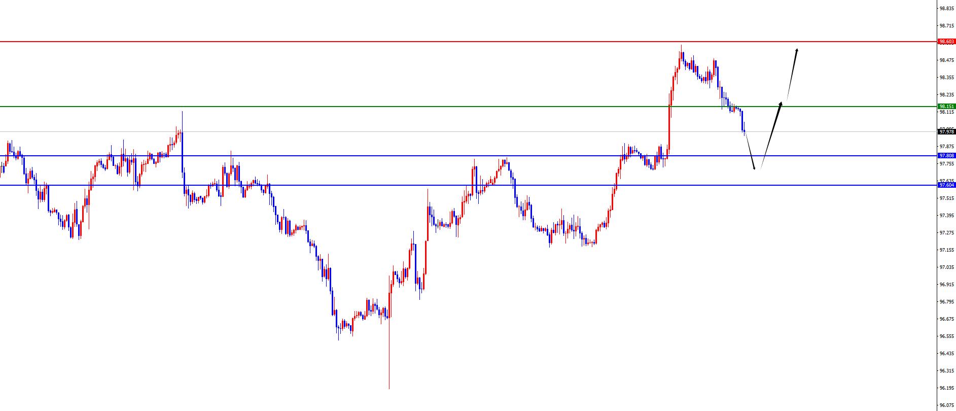 The US dollar index has a long range of 97.60-70, with a defense of 5 US dollars, and a target of 98.10-98.50