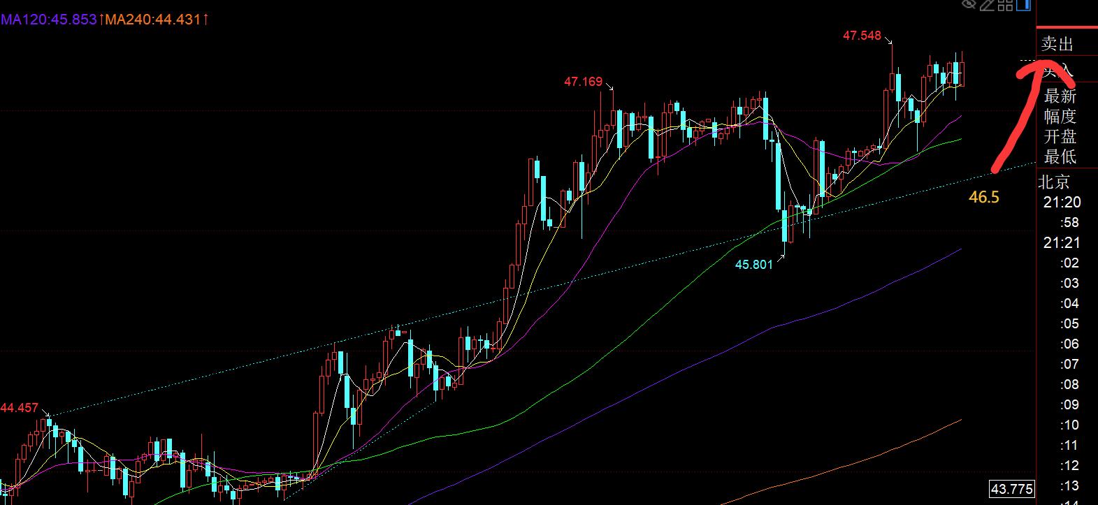 plateado: Del mismo modo, la línea diaria no ha vuelto a la promedio móvil 5 y está en su lugar. Es correcto atacar directamente la tendencia ascendente. La tendencia siempre es hacia arriba, lo que significa que el mejor punto alcista en el día no tiene oportunidades; Por lo tanto, también es optimista esta noche, pero ya no persigue el ascenso. Espero darle a un promedio móvil diario 5 la oportunidad de seguir la tendencia y ser optimista. También es la mejor punción. Cuanto más bajo sea el tirón, la reparación y la consolidación lateral se pueden llevar a cabo, para que se pueda llevar aún más en la etapa posterior; 46.4-46.5 El soporte es alcista;