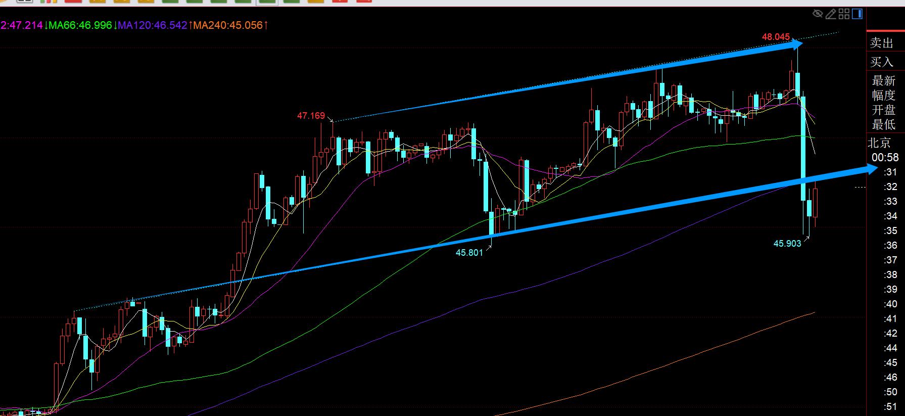 Silver: Tonight, there is also a dive, with a very strong force, which is 2 yuan directly; Dall'immagine sopra, infatti, dal punto di vista del canale, la linea 48 è esattamente la traccia superiore del canale blu e il supporto della pista inferiore si è rotto in questo momento e la resistenza confermata dal rimbalzo è la linea 46.58-46.6. Quando il rimbalzo iniziale, sarà ancora sotto pressione intorno alle 10 e continuerà a sopprimere la tendenza verso il basso. Presta attenzione alla stabilità del supporto 45,8 e 45 di seguito; Se 46.6 si rompe, torna nel canale, la linea 47 ha anche resistenza, e questa è anche una forte collina di Feng Shui. Se si rompe di nuovo, sarà un modo forte per colpire la pista superiore. La linea oraria d'argento è quasi riparata, ma è ancora un po 'inferiore a 2 ore, quindi deve ancora essere corretto per l'oscillazione e il declino. La linea giornaliera probabilmente perforà la media mobile 10 prima di guardare il segnale di stabilizzazione; the bull trend has remained unchanged, and the adjustment and correction is also to further attack in the future and break through the historical high before 49.8;