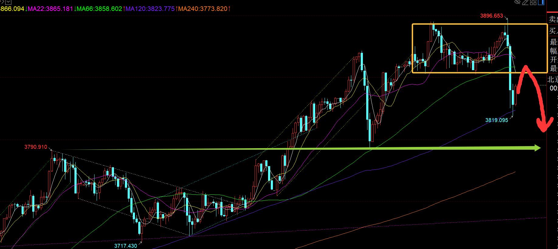 terzo, livello di linea orario dorato: dallo immagine sopra, il quadro di alto livello di 3853-3897 è stato rotto, 38La linea 53 diventa una certa contropressione e dopo la media mobile di 66 giorni, diventa anche una contropressione, circa 3858 linee; Pertanto, dopo un'ondata di declino e immersioni, 3853-58 e altri sono sotto pressione dopo aver toccato il trading precoce, puoi continuare a cadere in modo bearish e caduta, che è anche il livello di resistenza a 50 divini. Concentrati sul supporto della linea verde al di sopra di 3790. Se non è possibile tenerlo, non è possibile tenere la media mobile giornaliera 10, che amplierà ulteriormente la forza di correzione verso il basso; Se riesci a tenerlo, puoi rovesciare ed essere rialzista a basso livello; Inoltre, dovresti anche prestare attenzione al supporto della media mobile annuale, che è il prossimo supporto chiave che può essere raggiunto dopo aver forato attraverso 3790. Il 18 settembre, è stato inattivo per stabilizzare la media mobile annuale e quindi ha inaugurato un giro di forti attacchi unilaterali. Pertanto, dopo l'apertura della sessione asiatica al mattino, ha colpito per la prima volta 3853-58 sotto pressione e declino ribassista e ha continuato a abbassarsi. Se la linea oraria si rompe attraverso il 3858 sopra, è necessario regolare la sua posizione. L'obiettivo seguente è 3800-3790, quindi osserva i guadagni e le perdite efficaci di 3790. Se perfora, presta attenzione al segnale di supporto e stabilizzazione della media mobile annuale. Only when the short-term downward correction is in place can we continue to have the courage, strength, and sustainability to see the continuation of the unilateral rise;