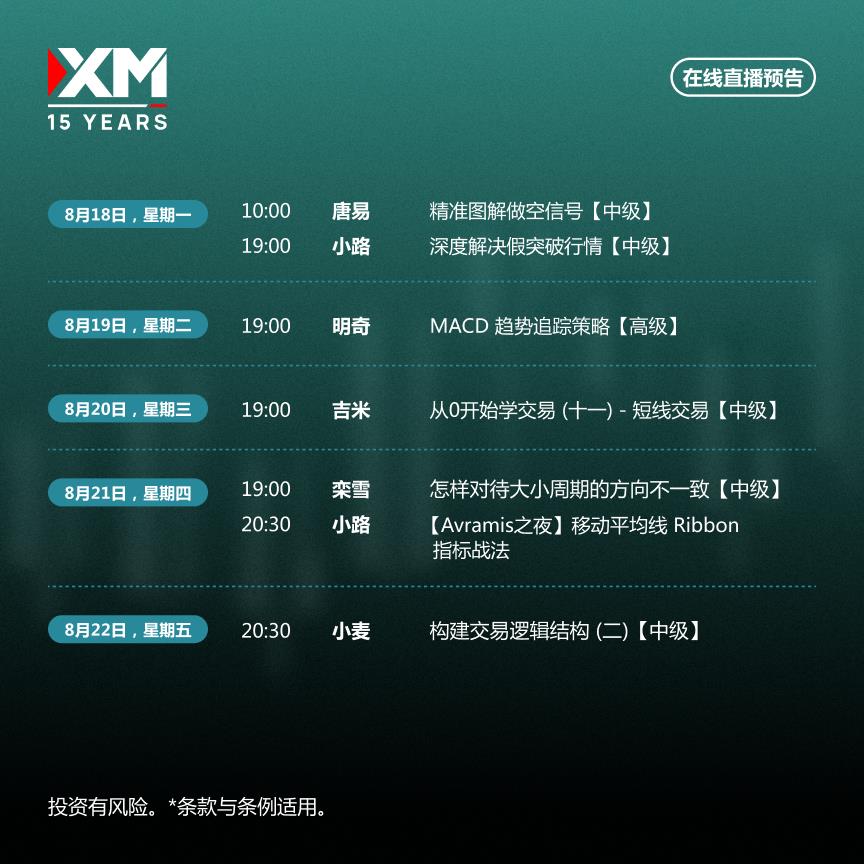 以上内容就是关于“【XM外汇决策分析】:中文在线直播讲座 本周预告”的全部内容,是由XM外汇小编认真整理编辑的,希望对你的交易有所帮助!感谢支持!
