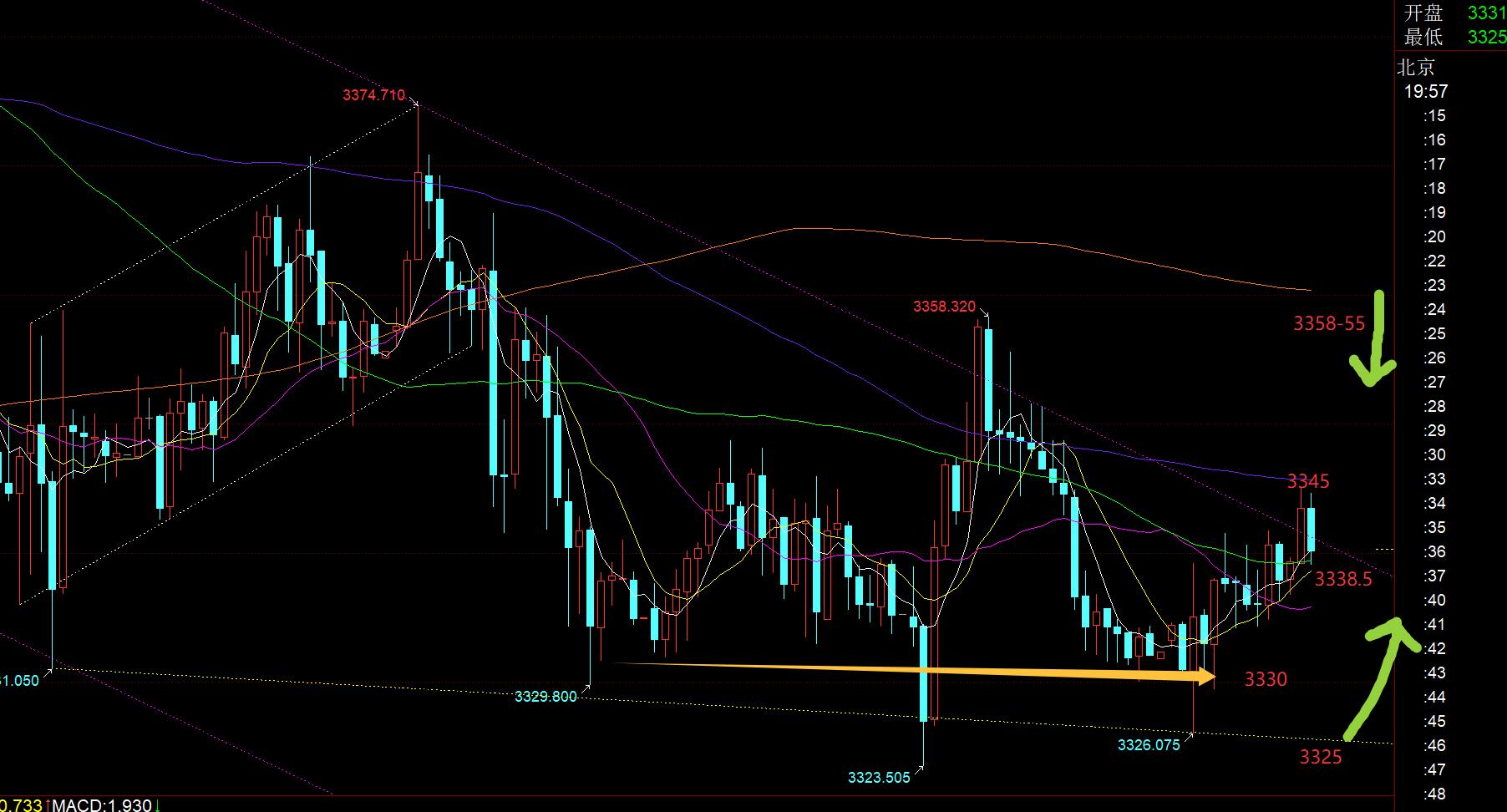 第一,黄金方面:昨日算是郁闷至极,一早等3322支撑看涨,价格略差1美金,直接急速探底拉升,眼看着它涨;午后回踩计划3340继续跟随看涨,只回踩3342,又差一点,又眼看着它一根饱满大阳直冲,这13点大阳有效突破了下滑趋势阻力上轨,结果却是一个烟雾弹,美盘前后3345上坚守几个小时,最终还是未守住,来了一波洗盘;前半场两次踏空,错失,后半场去跟随,却来了恶心的一波洗盘;