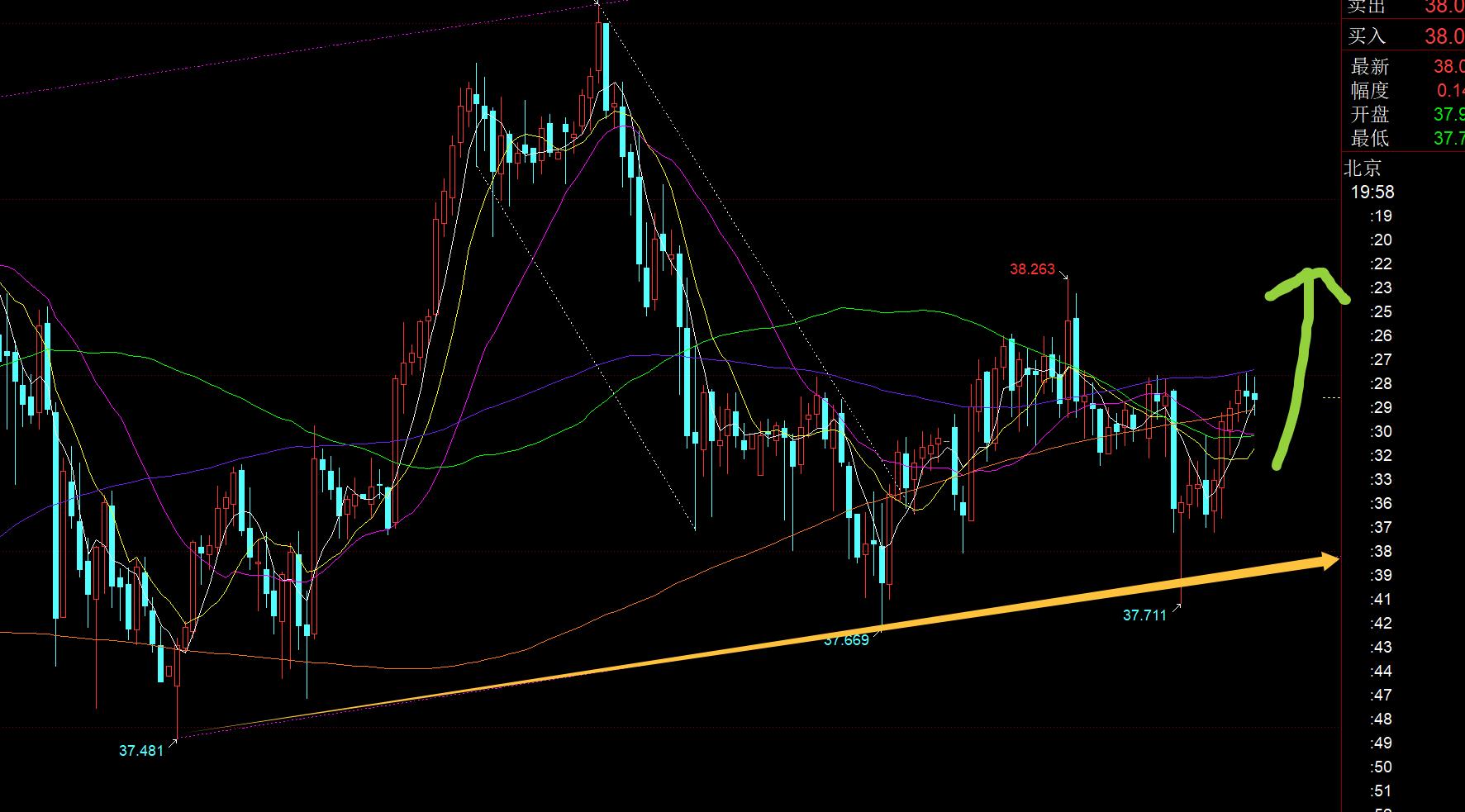 白银方面:白银短线走势是符合技术规律,亚盘拉升,欧盘震荡延续,美盘二次上拉,昨日如此,今日也会如此;早间探底触及通道下轨37.7支撑稳定后,探底拉升,欧盘震荡延续反弹,美盘37.8之上可继续看涨,日内低点作为风水岭,阻力目标38.25,突破再看38.4;走势比较缓慢,空间暂时不大,短线需见好就收;