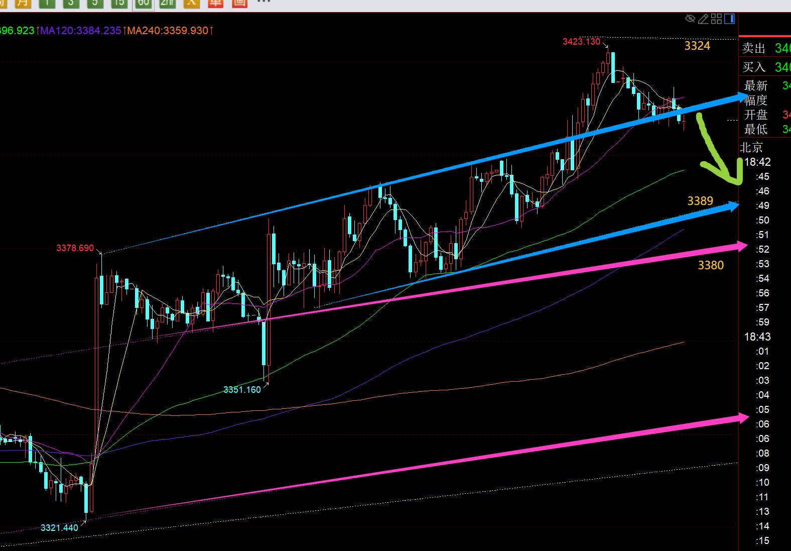 第一,黄金方面:昨日亚盘早间依旧走前两日循环,高位横盘于隔夜高点后,直接下跌,等靠近日线5均线3380上继续看涨,最低只给到3384.5;午后拉升一波,回踩计划3392继续看涨,结果只给到3393.5,两次都略差点,踏空;美盘参考研报3394上企稳则继续看涨,最终3400跟随看涨,3420半夜成功全止盈收米;也较为可惜,3452-3438这条趋势阻力线对应的衍生压力点3424附近,差1美金,好的看跌回落位置也就错失了;