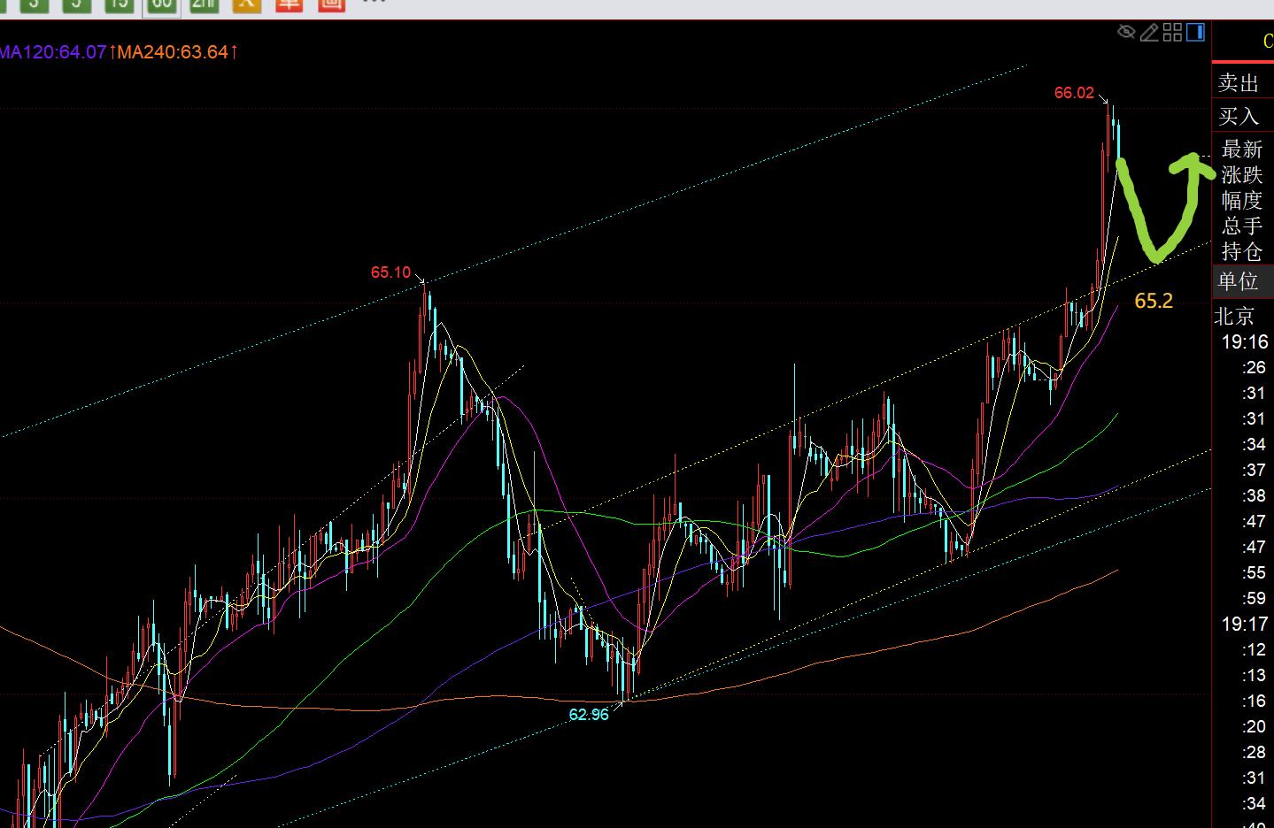 原油方面:日线昨日收阳先突破站上中轨,则倾向于延续向上反弹;今日欧盘持续连阳破高,美盘看二次拉升,留意黄色通道回踩确认支撑65.2,企稳看涨;