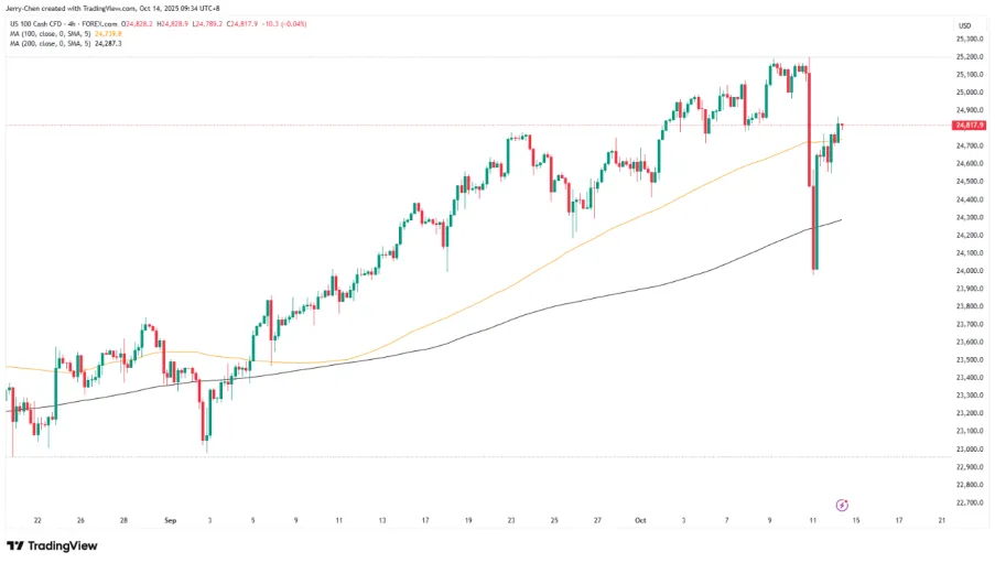 值得注意的是,随着伦敦白银库存告急,伦敦白银现货价格和纽约期货价格出现了史无前例的溢价水平。尽管有大量的纽约白银库存正在运往伦敦,但在强劲的投资和实物需求驱动下,白银的疯狂或将持续。 美国银行将2026年黄金目标价格上调至5000美元/盎司,白银上调至65美元/盎司。 货币市场,澳元隔夜领涨,日元和欧元则跌幅居前,美/日收盘重回152上方。 周二关注鲍威尔讲话(23:30)以及摩根大通、高盛、花旗等银行股财报。在经济数据真空的情况下,财报或具有更大的参考价值。 来源:TradingView,Forex.com 美/日周一在151.20附近企稳后延续上行,在趋势线的帮助下汇价有望继续向前高153.30迈进,突破后多头目标上移至154-155区域。日本国内政局变化是日元现阶段走弱的主要原因,日本央行年内加息概率已经不足40%。 下行方向,若跌破150后恐再次下探146.50一线。 来源:TradingView,Forex.com 随着关税威胁降温以及AI热潮的延续,市场情绪迎来急速反转,这有望帮助纳斯达克100指数继续收复周五的失地,并挑战前高25200。 反之,若跌破24550后将增加高位震荡的概率,但在宏观黄金维持稳定的情况下,逢低买入依然适用。 以上内容就是关于“【XM外汇官网】:【今日重点关注】金银势不可挡,TACO交易助力美股反弹”的全部内容,是由XM外汇小编认真整理编辑的,希望对你的交易有所帮助!感谢支持! 因笔者能力有限、时间紧迫等原因,文中有些内容仍需继续探讨和深入研究。因此,今后笔者将就下列问题进行延伸性的研究和探讨:USDJPY4小时